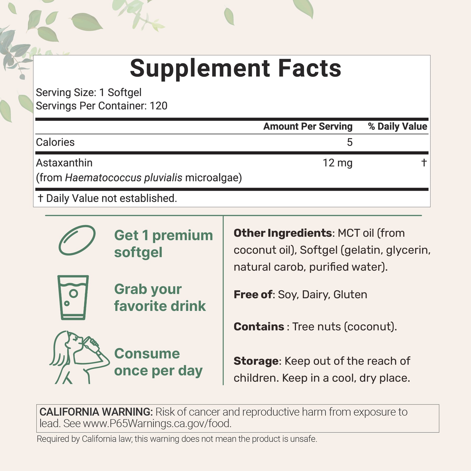 • Micro Ingredients offers max strength Astaxanthin softgels, offering a high potency of 12mg natural astaxanthin per serving. Each one-a-day softgel provides up to a 120-day supply.